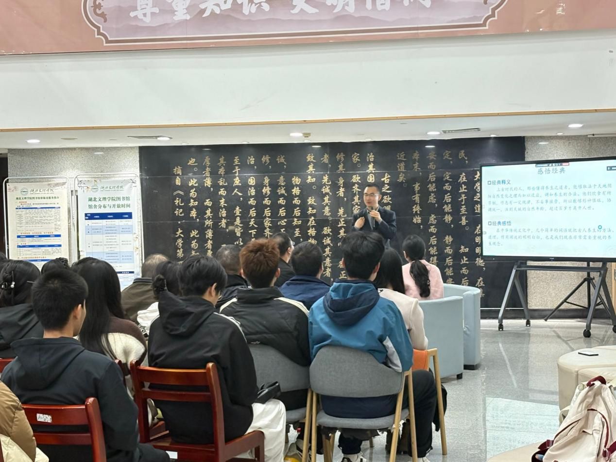 (襄阳历史文化研究院·汉江研究院 通讯员 高慧霞)11月6日下午,第四十七期“湖文读书会”在图书馆二楼德园举行。学校体育学院副教授王红俊以“康”为主题作经典导读分享。学校党委副书记王瑶珺出席活动。