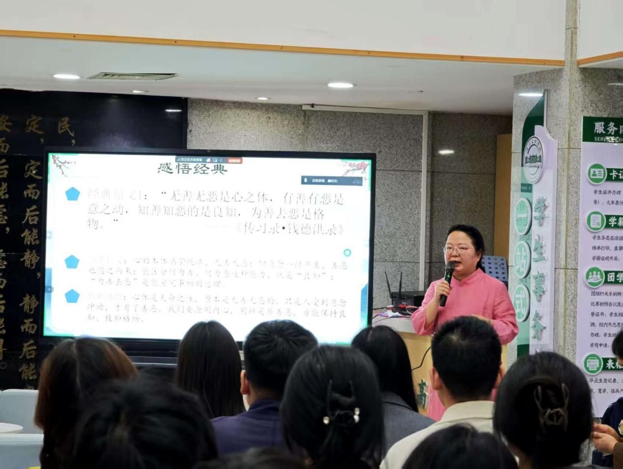 在诵读经典环节,师生共同诵读了《道德经》《礼记》《传习录》《论语》《荀子》《孟子》等著作中关于“善”的名句。
