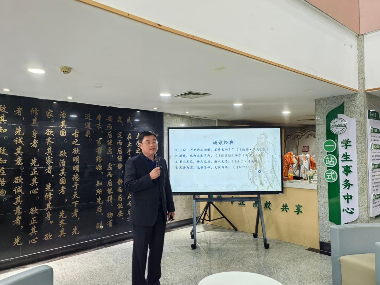 在感悟经典环节,高新伟从“无”字的文字溯源与经典内涵出发,系统梳理了《道德经》《论语》《庄子》等经典中关于“无”的哲学意蕴。他指出,“无”并非简单的“没有”,而是中华哲学体系中一个极具张力的核心概念。在高新伟的引导下,师生共同走进《道德经》中“无,名天地之始”的宇宙观,体味《论语》中“毋意、毋必、毋固、毋我”的修身智慧,感悟《庄子》“至人无己,神人无功,圣人无名”的精神境界,这些思想共同构成了中华文化中关于“无”的丰富体系。